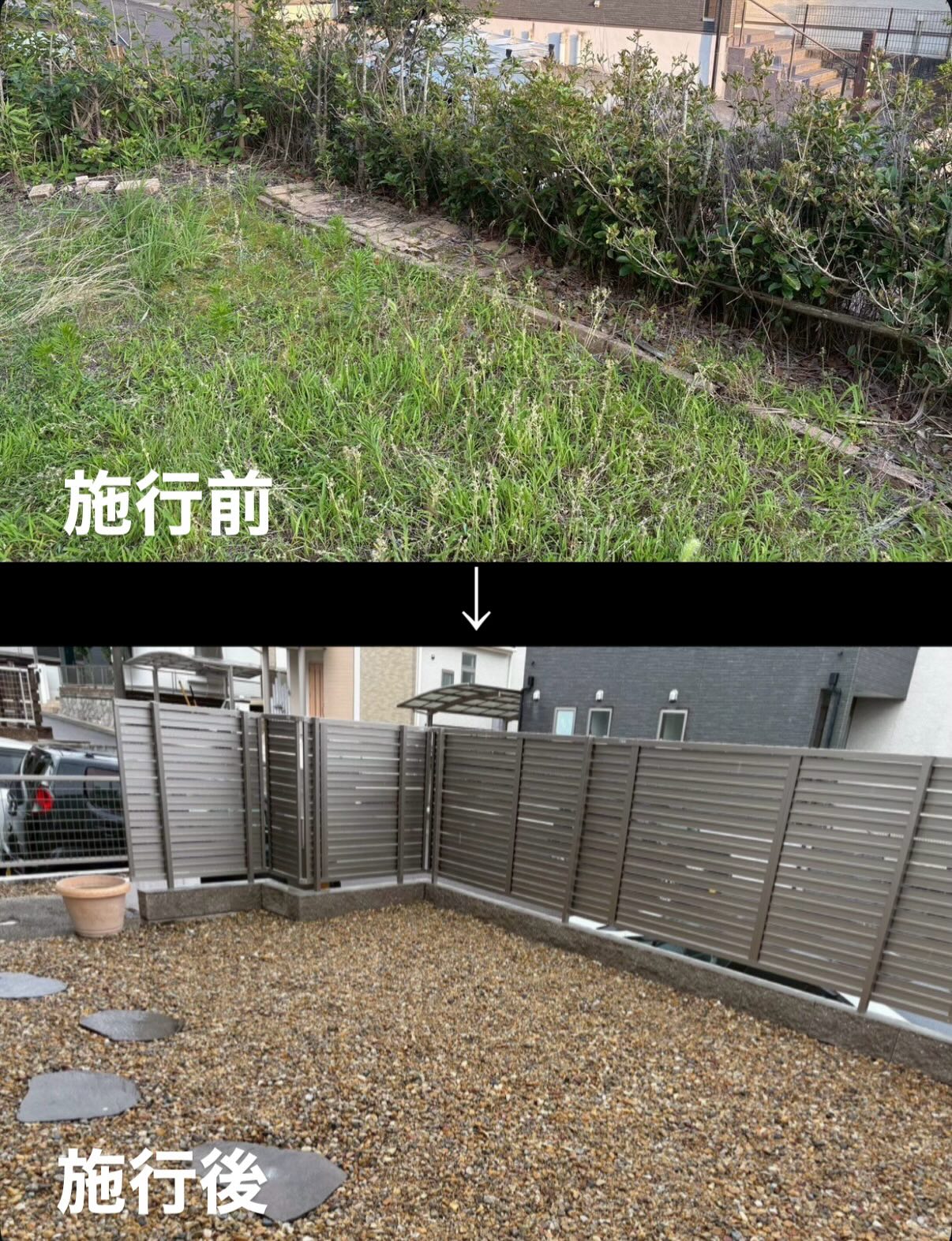 写真からもお分かりのように、伸び放題の植栽と雑草、、、毎年奥様が除草剤を撒いたりととにかく大変とのことでトライ!